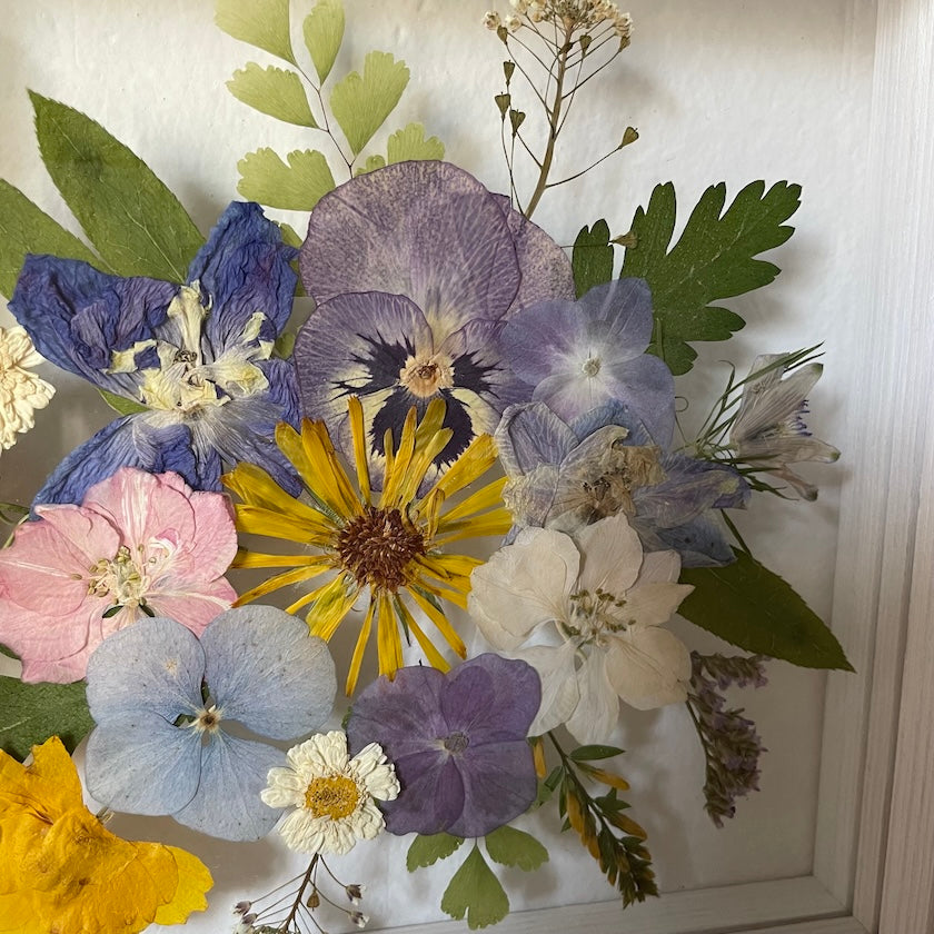 Květinový ručně vyrobený obraz s květy modrých, fialových a žlutých barviček, které rostou ze středu obrazu. Mezi květy najdete hortenzie, macešky, ostrožky a mnoho dalšího.
