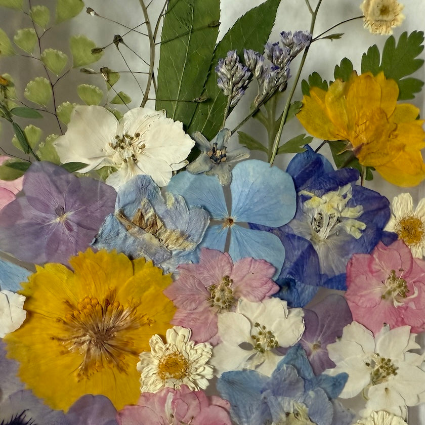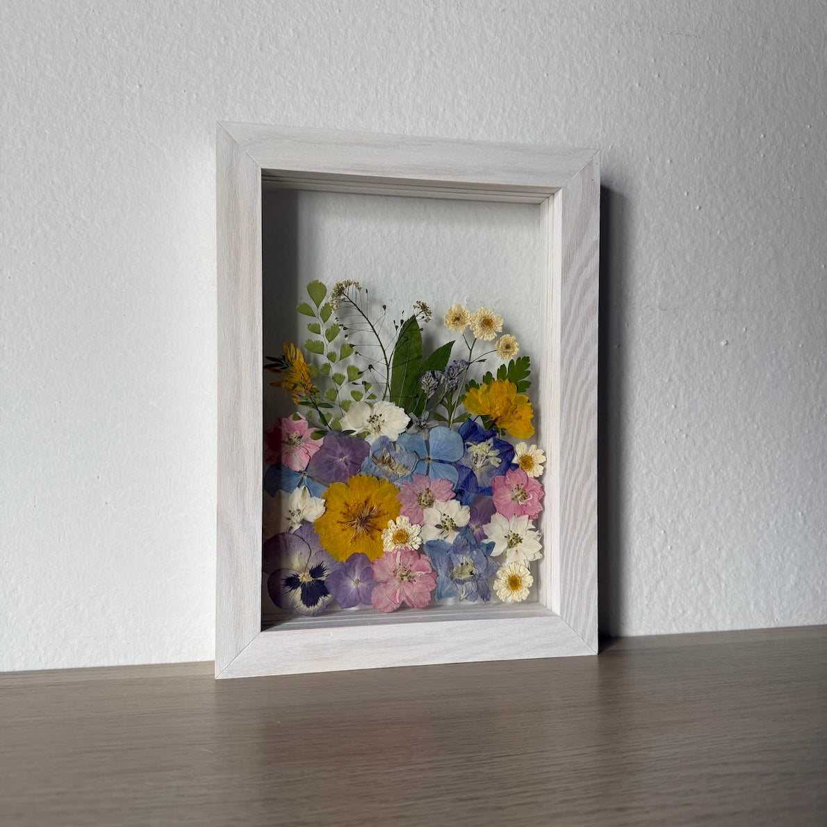 Květinový ručně vyrobený obraz s květy v růžových, žlutých a modrých barvách, které rostou ze spodu obrazu. Mezi květy najdete macešku, hortenzie, ostrožky a mnoho dalšího.