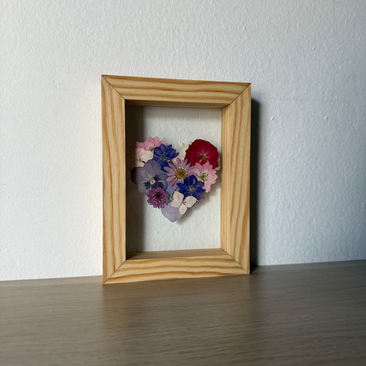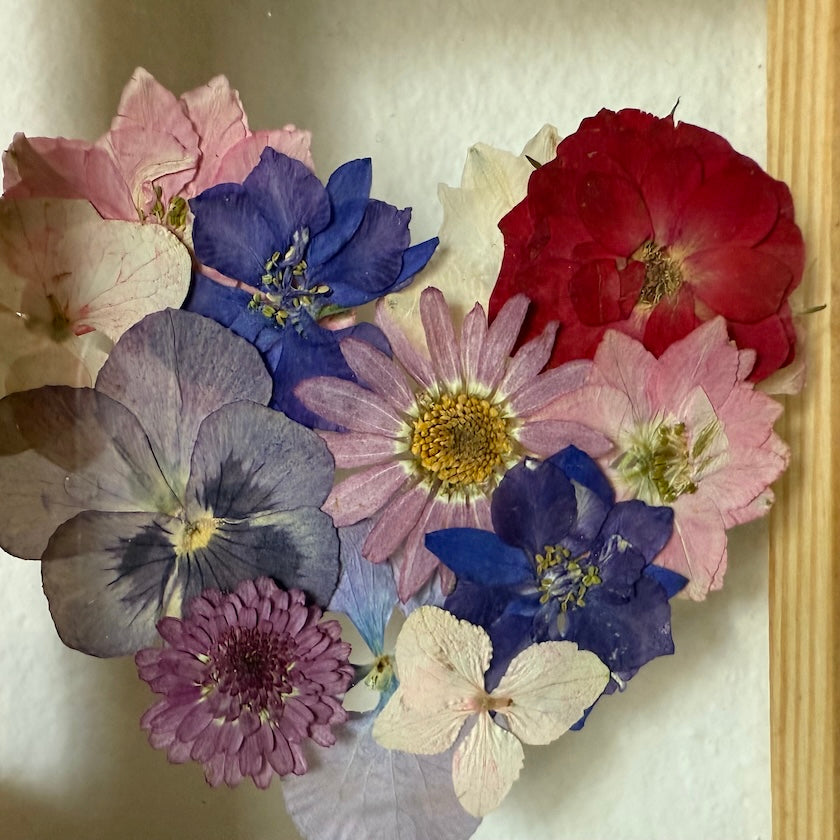 Květinový ručně vyrobený obraz s květy bílých, modrých, růžových a červených barviček, které rostou ve tvaru srdce ze středu obrazu. Mezi květy najdete květy třešní, růže, ostrožky a mnoho dalšího.