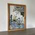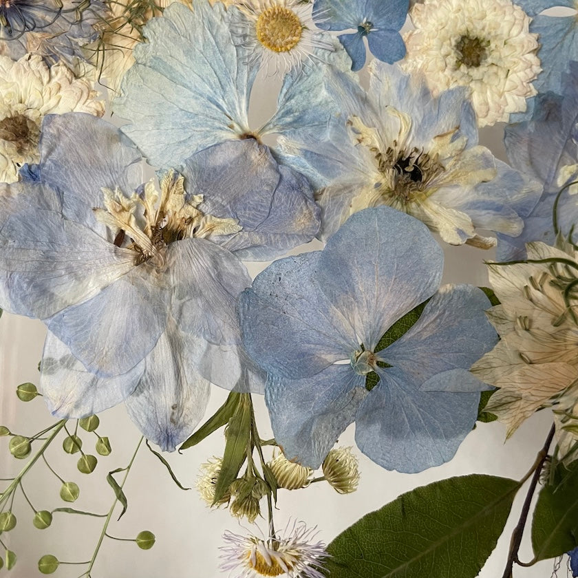 Květinový ručně vyrobený obraz s květy modrých a bílých odstínů, které rostou z rohů obrazu. Mezi květy najdete květy hortenzie, černuchy a mnoho dalšího.