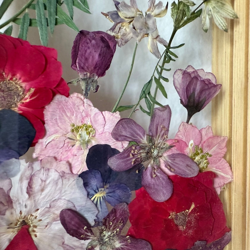 Květinový ručně vyrobený obraz s květy růžových, fialových a červených barev, které rostou ze spodu obrazu. Mezi květy najdete růže, macešku, ostrožky a další.