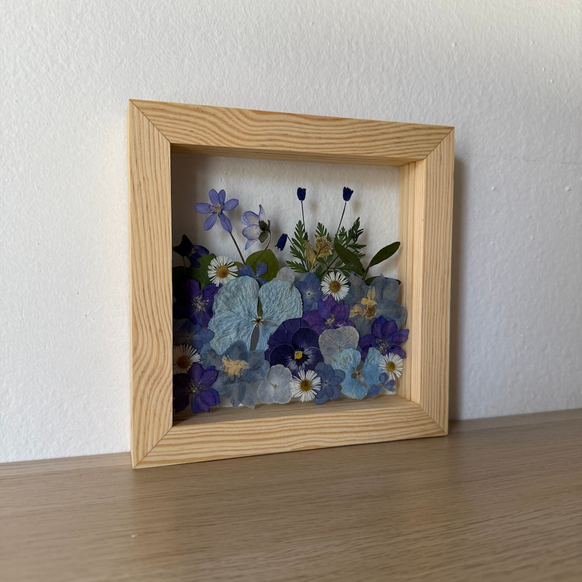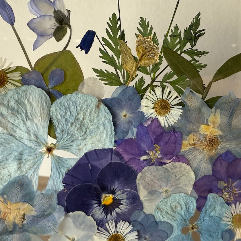 Květinový ručně vyrobený obraz s květy modrých a bílých barviček, které rostou ze spodu obrazu. Mezi květy najdete hortenzie, macešky, ostrožky a mnoho dalšího.