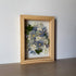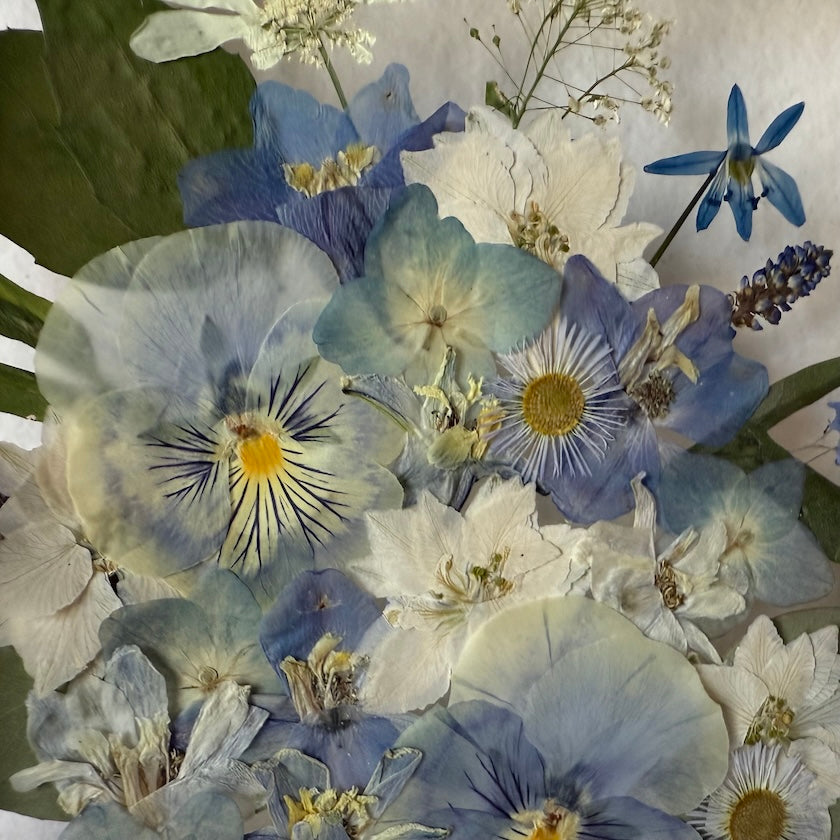 Květinový ručně vyrobený obraz s květy v modrých a bílých barvách, které rostou ze středu obrazu. Mezi květy najdete hortenzie, ostrožky, macešky a mnoho dalšího.