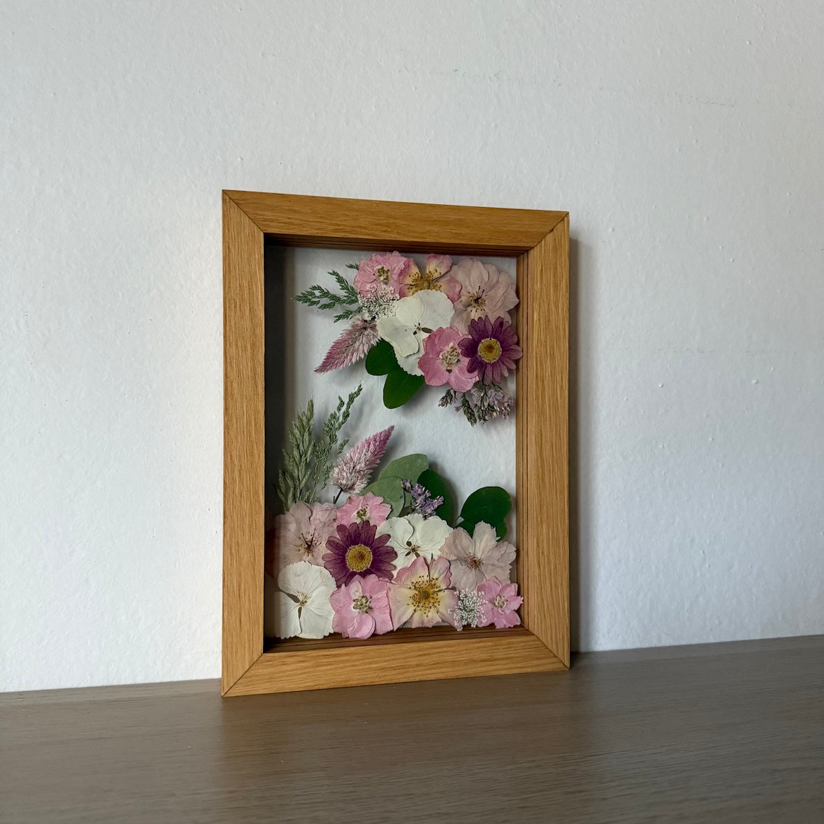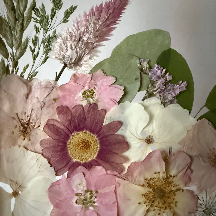 Květinový ručně vyrobený obraz s květy v růžových a bílých barvách, které rostou z rohů obrazu. Mezi květy najdete květy třešní, hortenzie a mnoho dalšího.
