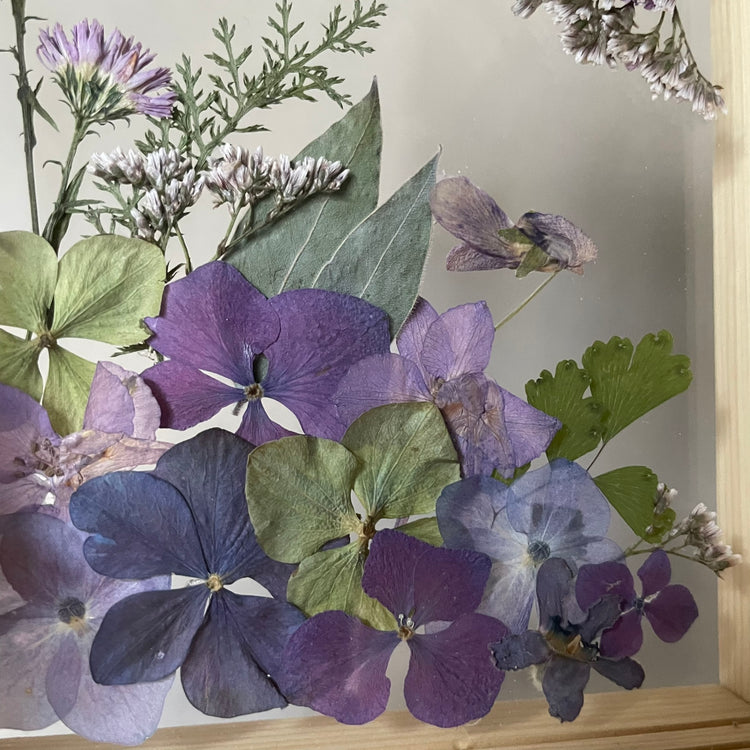 Květiny jsou zasazeny mezi skla a doplněny ručně vyráběným dřevěným rámem, který vzniká přímo v naší dílně. 🪵
