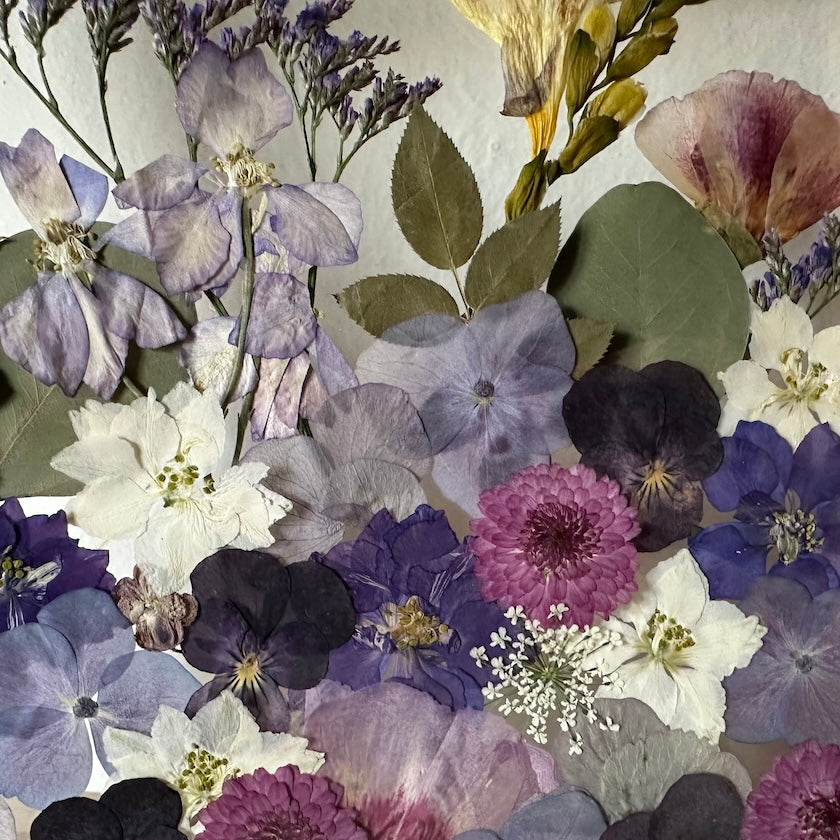 Květinový ručně vyrobený obraz s květy v modrých, fialových a bílých barvách, které rostou ze spodu obrazu. Mezi květy najdete hortenzie, macešky, ostrožky a mnoho dalšího.