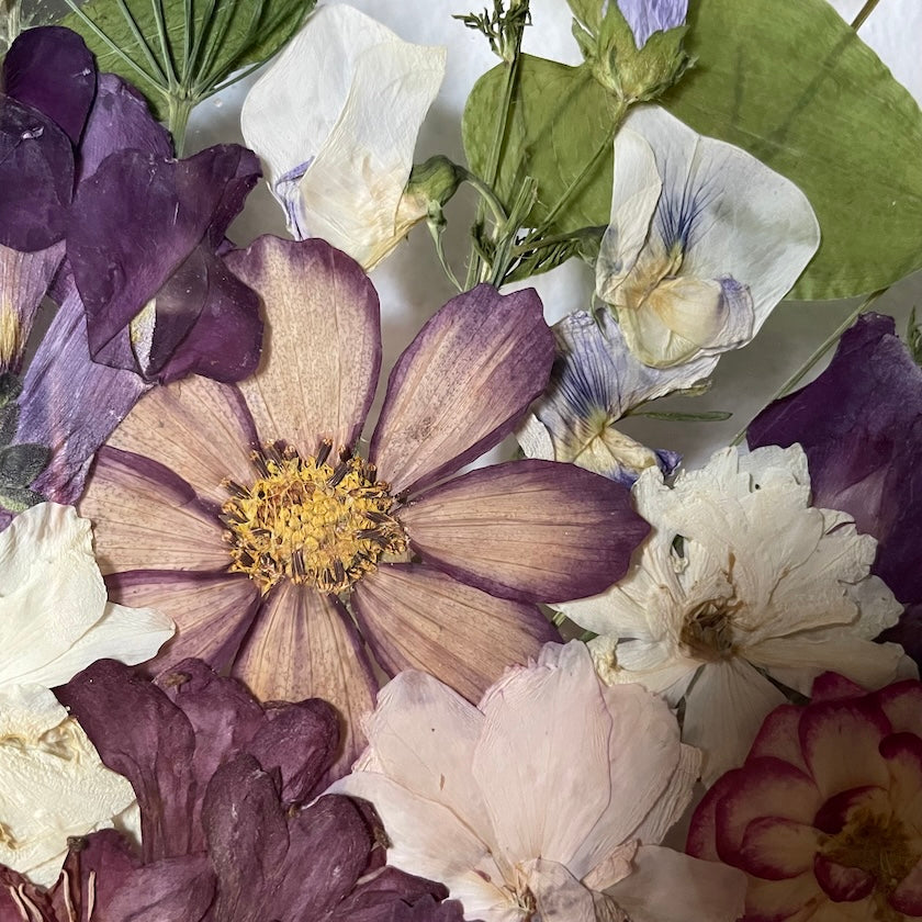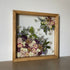 Květinový ručně vyrobený obraz s květy v růžových, bílých a fialových barvách, které rostou z rohů obrazu. Mezi květy najdete krásenky, květy třešní, růže a mnoho dalšího.