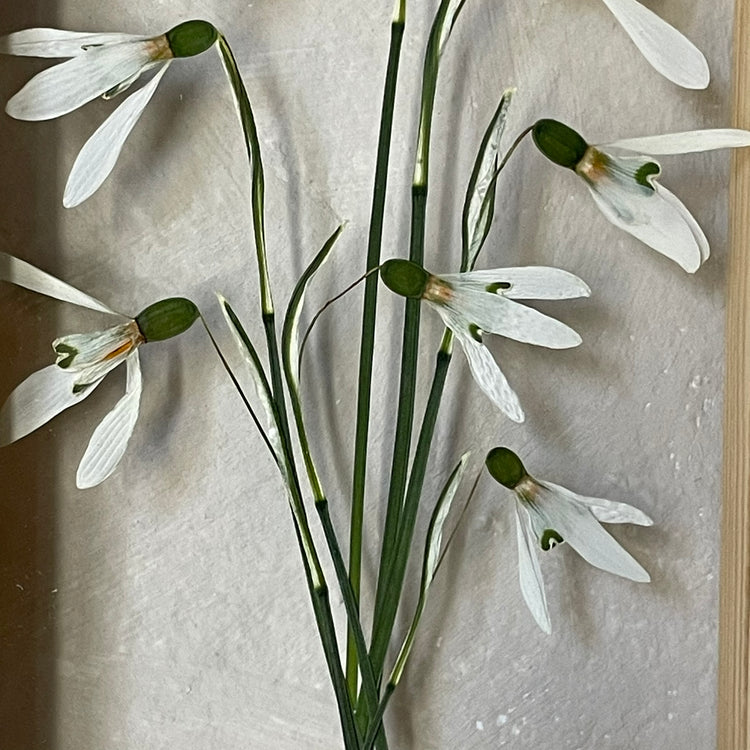 Květinový ručně vyrobený obraz s květy sněženek, které rostou ze středu obrazu.