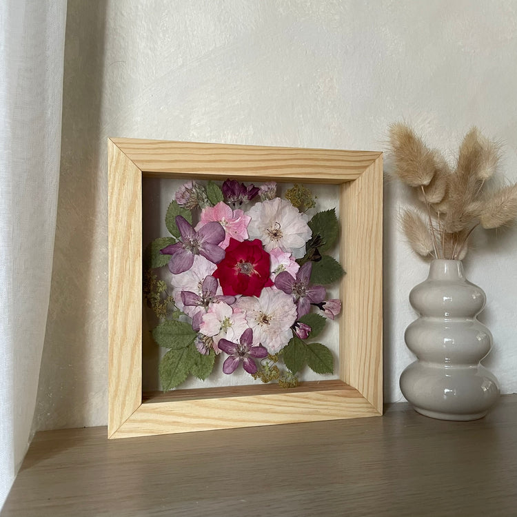 Květiny jsou zasazeny mezi skla a doplněny ručně vyráběným dřevěným rámem, který vzniká přímo v naší dílně. 🪵