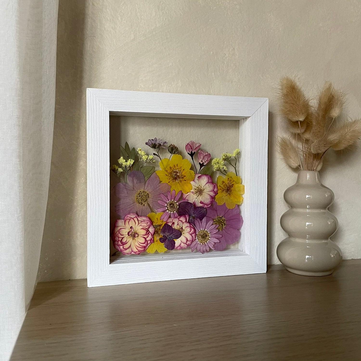 Použité květiny a rostliny jsou skutečné, ručně sbírané a šetrně lisované, aby si zachovaly svou přirozenou strukturu, jemnost i barevnost. 🌿 Následně jsou s citem aranžovány do jedinečné kompozice – každý obraz je originál, žádné dva kusy nejsou stejné.