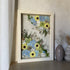 Květinový ručně vyrobený obraz s květy v modrých, žlutých a bílých barvách, které rostou z rohů obrazu. Mezi květy najdete hortenzie, jarmanky, sasanky a mnoho dalšího.
