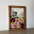 Květinový ručně vyrobený obraz s květy ve žlutých, růžových a modrých barvách, které rostou ze spodu obrazu. Mezi květy najdete růže, ostrožky, květy třešní a mnoho dalšího.