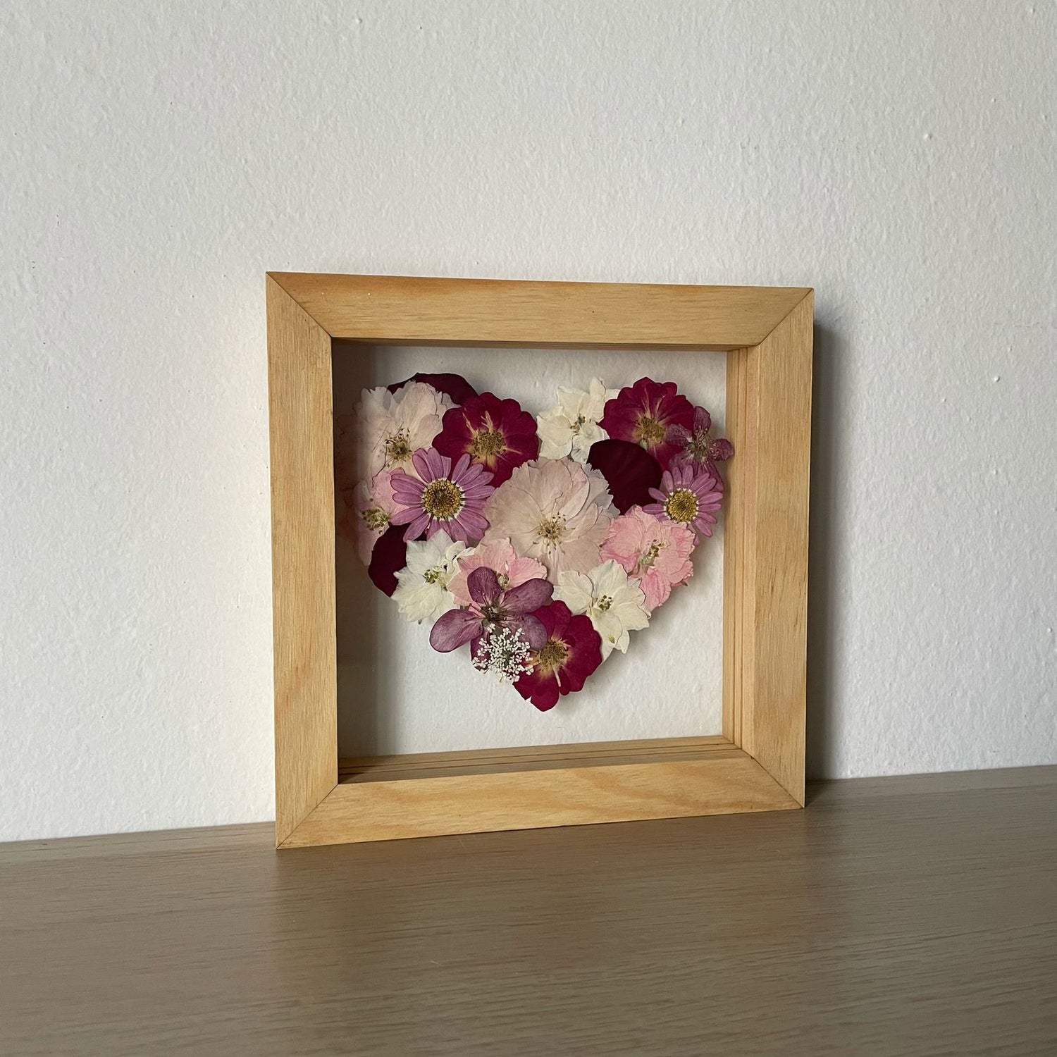 Květinový ručně vyrobený obraz s květy růžových, červených a bílých barviček, které rostou ve tvaru srdce. Mezi květy najdete růže, ostrožky a mnoho dalšího.