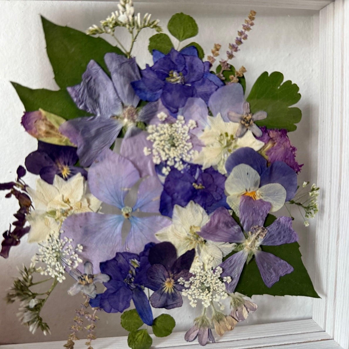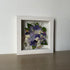 Květinový ručně vyrobený obraz s květy modrých, fialových a bílých barviček, které rostou ze středu obrazu. Mezi květy najdete hortenzie, macešky, ostrožky a mnoho dalšího.