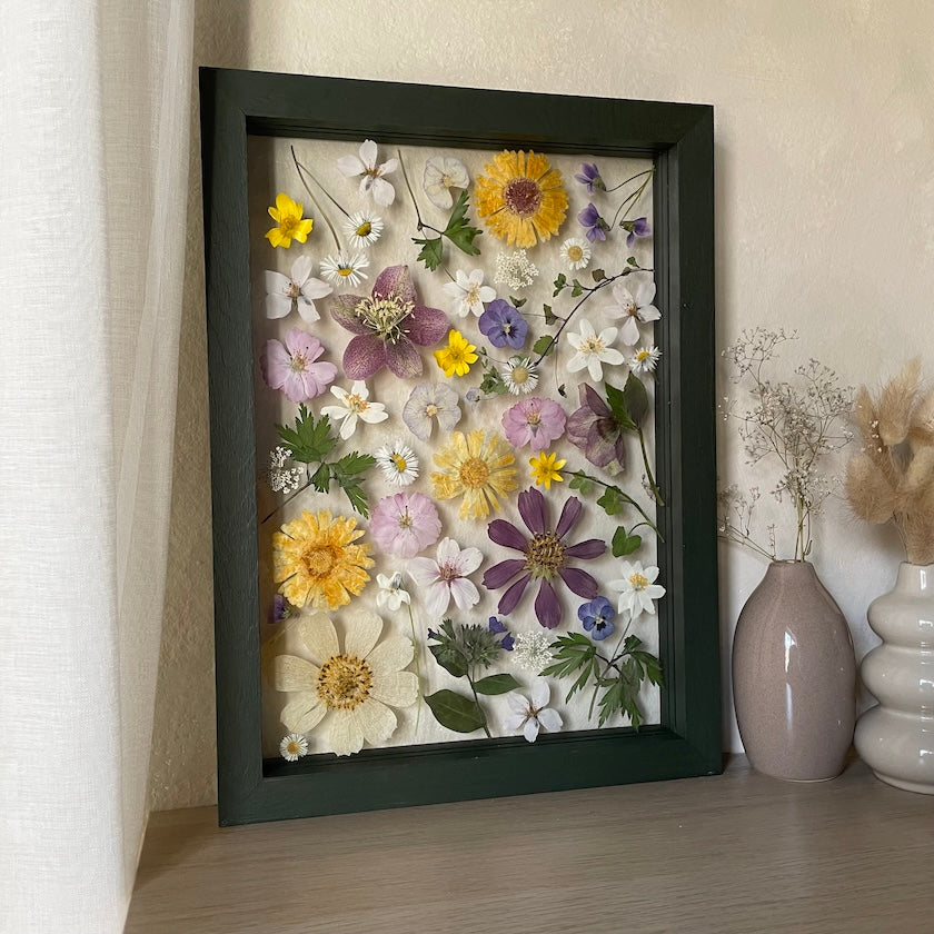 Použité květiny a rostliny jsou skutečné, ručně sbírané a šetrně lisované, aby si zachovaly svou přirozenou strukturu, jemnost i barevnost. 🌿 Následně jsou s citem aranžovány do jedinečné kompozice – každý obraz je originál, žádné dva kusy nejsou stejné.
