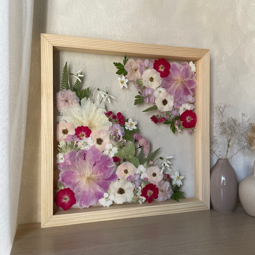Květiny jsou zasazeny mezi skla a doplněny ručně vyráběným dřevěným rámem, který vzniká přímo v naší dílně. 🪵