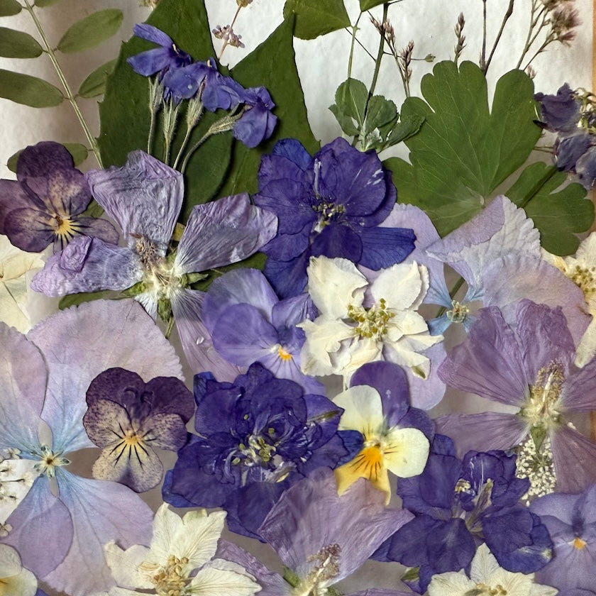 Květinový ručně vyrobený obraz s květy v modrých, fialových a bílých barvách, které rostou ze spodu obrazu. Mezi květy najdete hortenzie, ostrožky, macešky a mnoho dalšího.