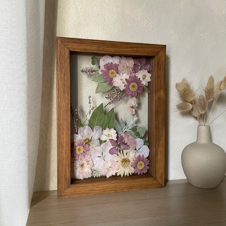 Květiny jsou zasazeny mezi skla a doplněny ručně vyráběným dřevěným rámem, který vzniká přímo v naší dílně. 🪵