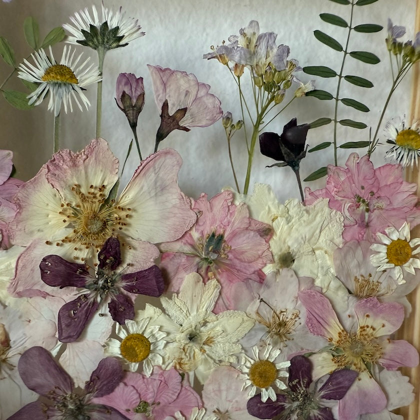 Květinový ručně vyrobený obraz s květy růžových a bílých barviček, které rostou za spodu obrazu. Mezi květy najdete růže, ostrožky, květy třešní a mnoho dalšího.
