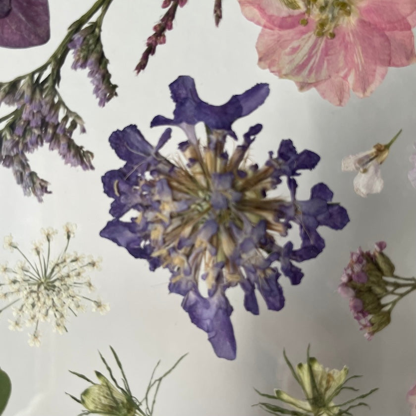 Květinový ručně vyrobený obraz s květy v růžových a modrých barvách, které rostou po celém obrazu. Mezi květy najdete květy třešní, ostrožky, hortenzie a mnoho dalšího.