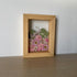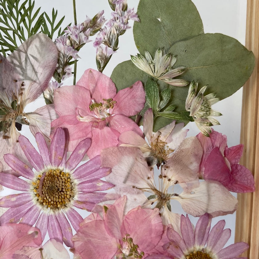 Květinový ručně vyrobený obraz s květy růžových a bílých barev, které rostou ze spodu obrazu. Mezi květy najdete ostrožku, květy třešní a mnoho dalšího.