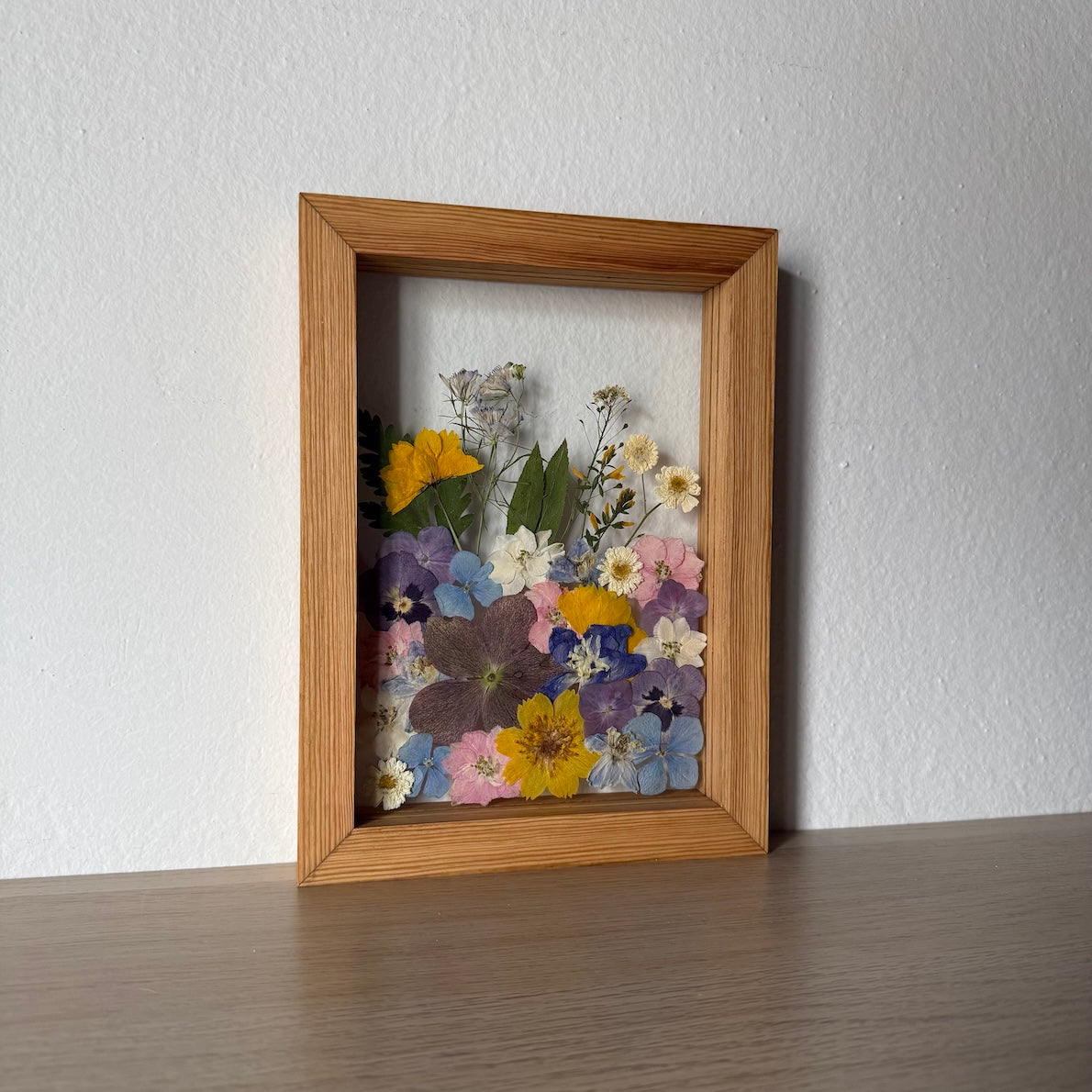 Květinový ručně vyrobený obraz s květy v růžových, žlutých a modrých barvách, které rostou ze spodu obrazu. Mezi květy najdete čemeřici, ostrožky a mnoho dalšího.