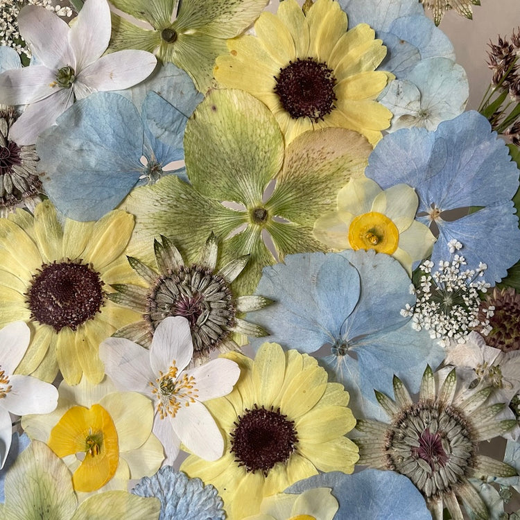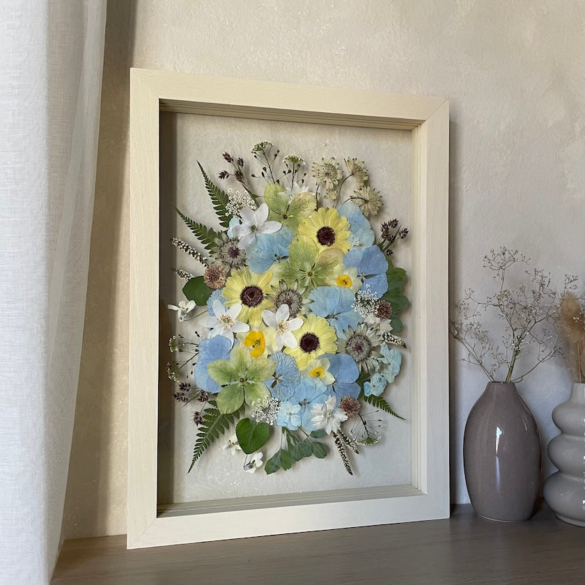 Použité květiny a rostliny jsou skutečné, ručně sbírané a šetrně lisované, aby si zachovaly svou přirozenou strukturu, jemnost i barevnost. 🌿 Následně jsou s citem aranžovány do jedinečné kompozice – každý obraz je originál, žádné dva kusy nejsou stejné.