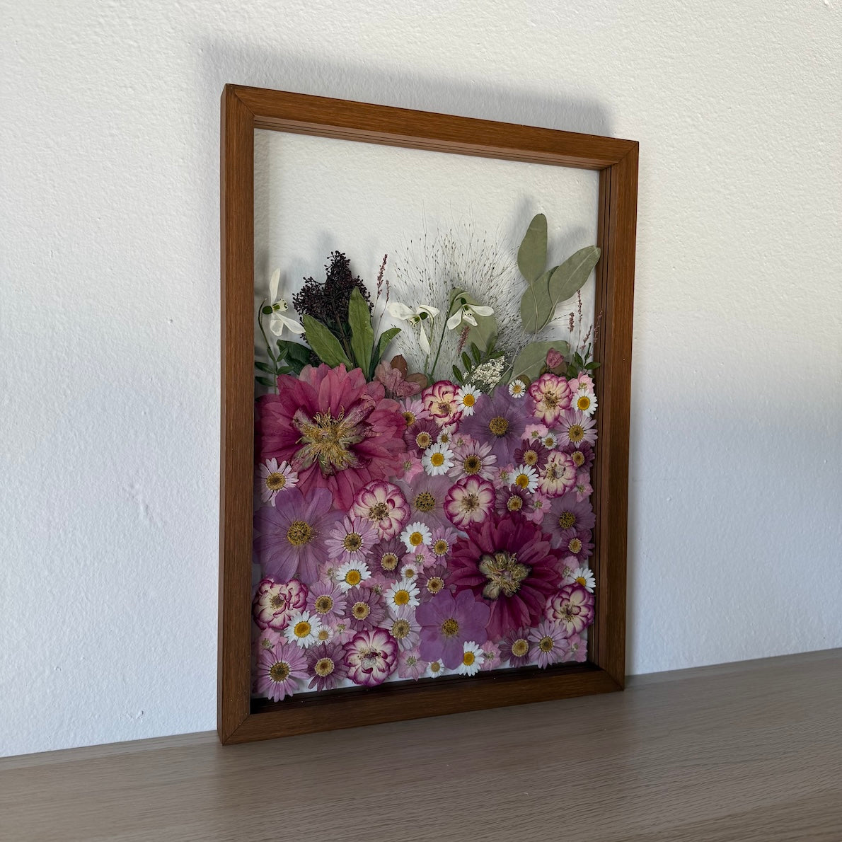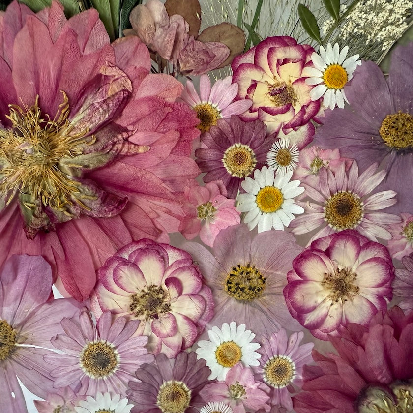 Květinový ručně vyrobený obraz s květy růžových, vínových a bílých odstínů, které rostou ze spodu obrazu. Mezi květy najdete květy růže, pivoňky, ostrožky, kopretiny a mnoho dalšího.