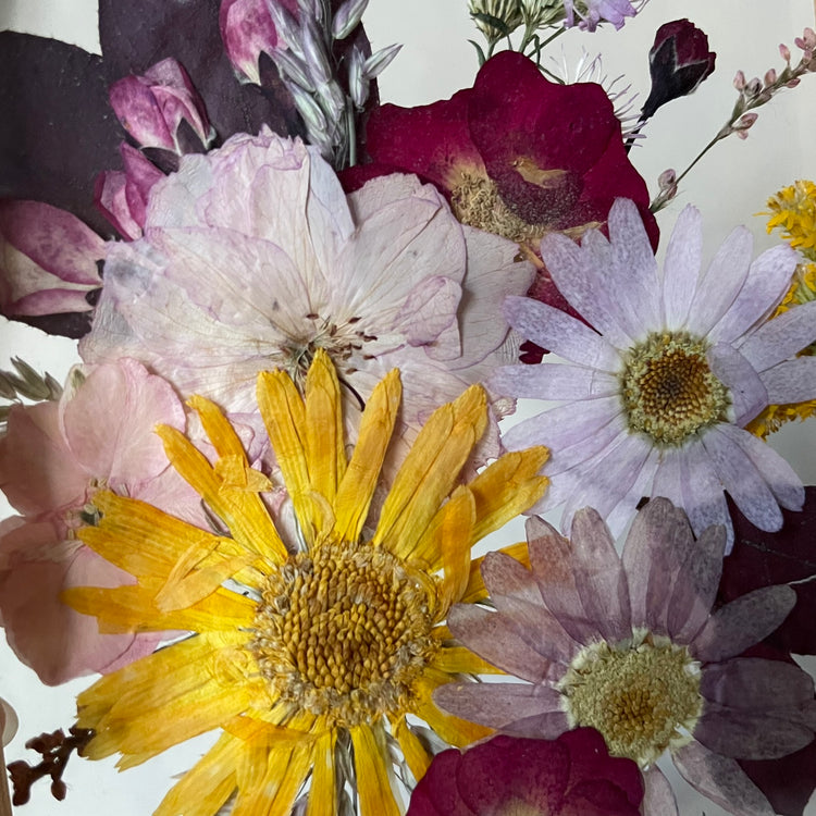 Použité květiny a rostliny jsou skutečné, ručně sbírané a šetrně lisované, aby si zachovaly svou přirozenou strukturu, jemnost i barevnost. 🌿 Následně jsou s citem aranžovány do jedinečné kompozice – každý obraz je originál, žádné dva kusy nejsou stejné.