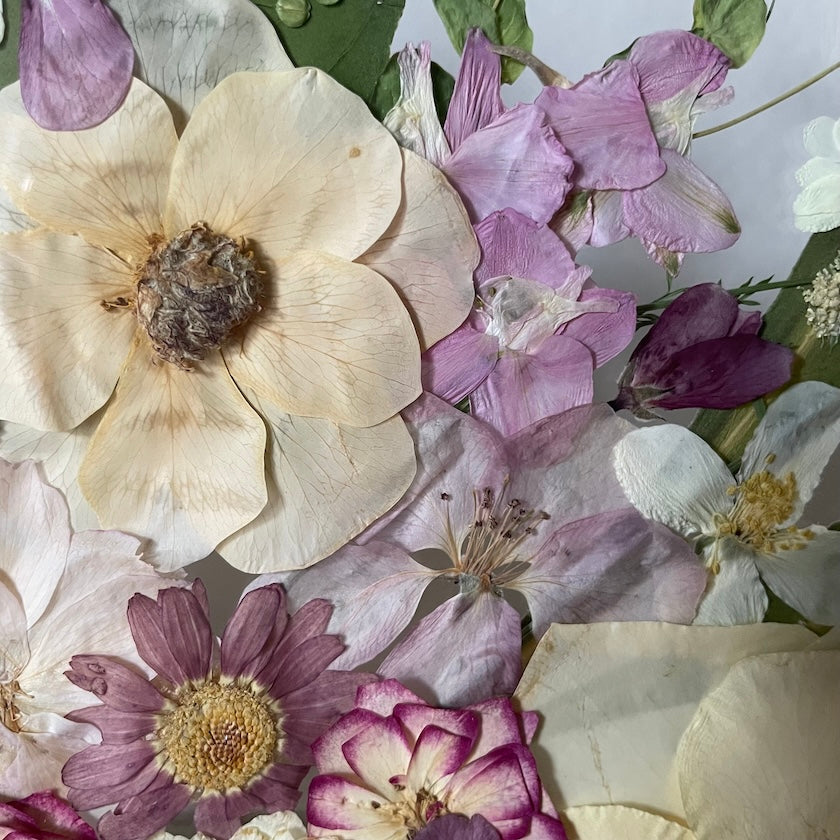 Květinový ručně vyrobený obraz s květy v růžových a bílých odstínech, které rostou z rohů obrazu. Mezi květy najdete květy růže, pivoňku, ostrožky a mnoho dalšího.