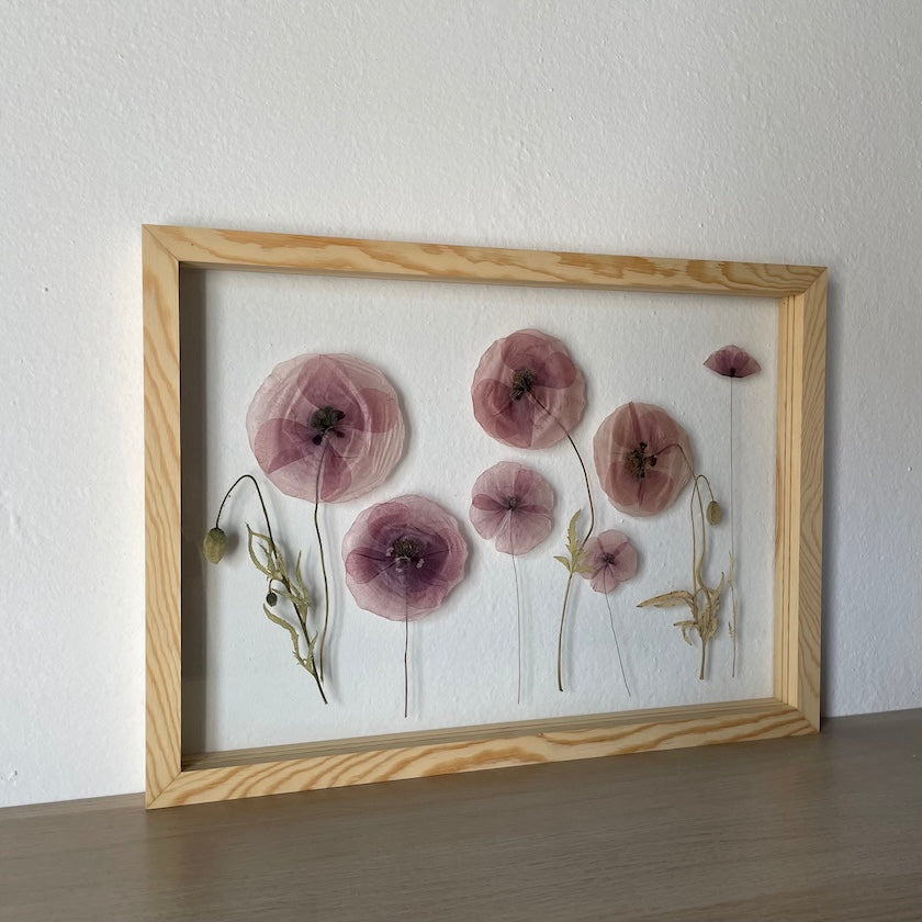 Květinový ručně vyrobený obraz s květy máků, které rostou ze středu obrazu.