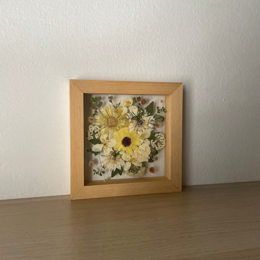Květinový ručně vyrobený obraz s květy žlutých a bílých barviček, které rostou ze středu obrazu. Mezi květy najdete černuchy, měsíčky, jasmín a mnoho dalšího.
