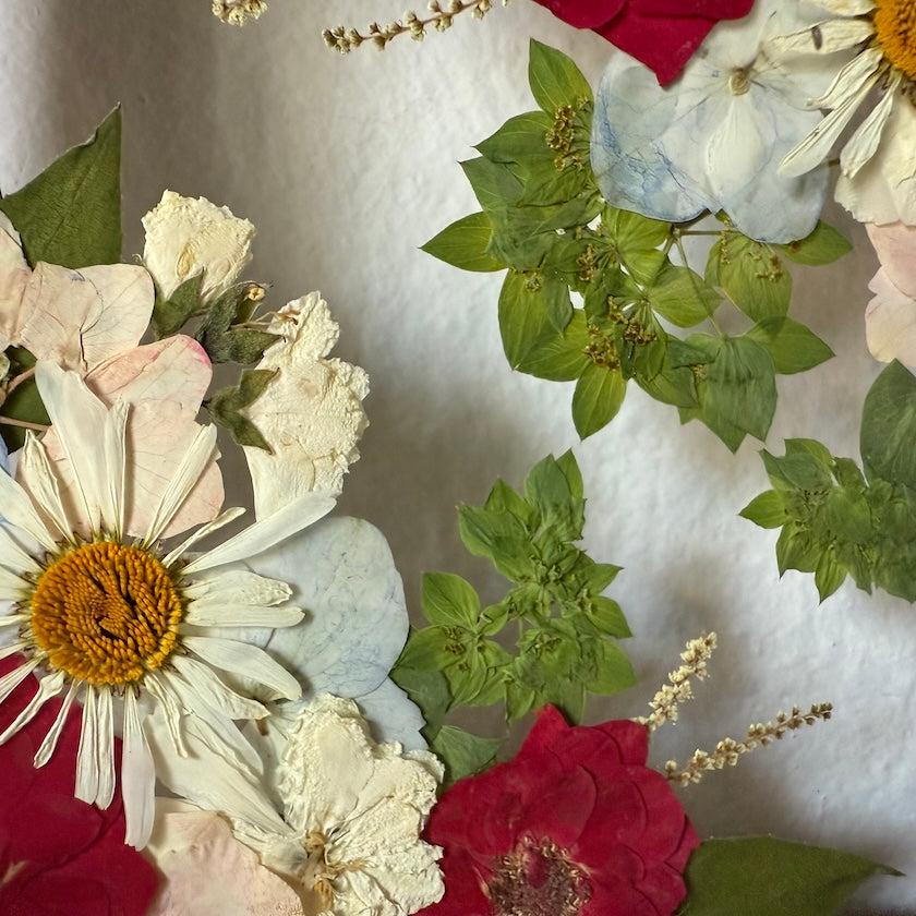 Květinový ručně vyrobený obraz s květy červených, modrých a bílých barviček, které rostou z rohů obrazu. Mezi květy najdete růže, kopretiny, květy třešní a mnoho dalšího.