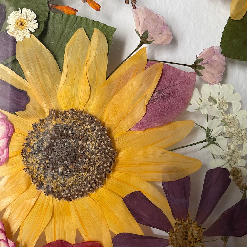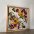 Květinový ručně vyrobený obraz s květy v oranžových, růžových a fialových barvách, které rostou z rohů obrazu. Mezi květy najdete krásenky, slunečnice, jiřiny a mnoho dalšího.