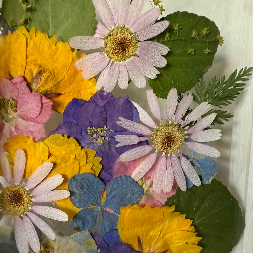 Květinový ručně vyrobený obraz s květy růžových, modrých a žlutých barviček, které rostou z rohu obrazu. Mezi květy najdete kopretiny, chryzantémy, ostrožky a mnoho dalšího.