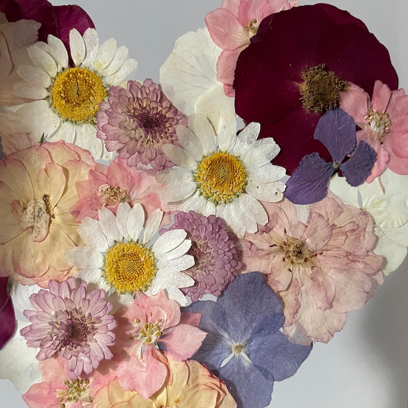 Květinový ručně vyrobený obraz s květy růžových, bílých a modrých barviček, které rostou ve tvaru srdce ze středu obrazu. Mezi květy najdete růže, květy třešní, ostrožky a mnoho dalšího.