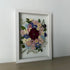 Květinový ručně vyrobený obraz s květy v červených, růžových, modrých a bílých barvách, které rostou ze středu obrazu. Mezi květy najdete růže, květy třešní, hortenzie a mnoho dalšího.