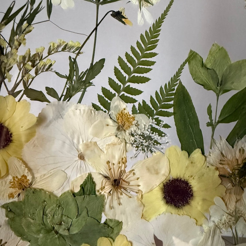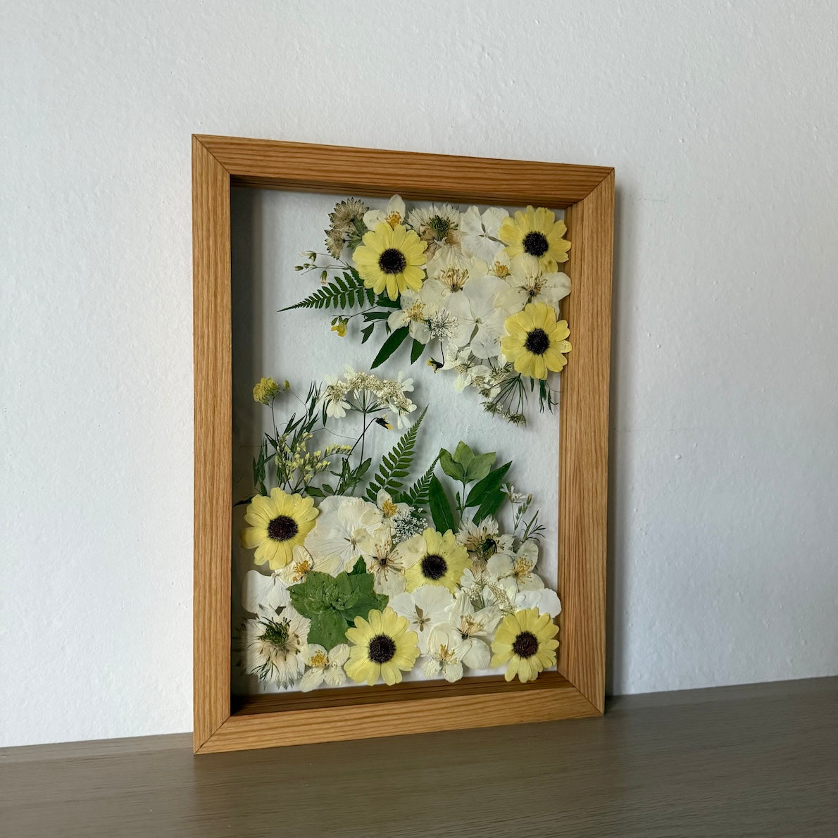 Květinový ručně vyrobený obraz s květy v žlutých a bílých barvách, které rostou z rohů obrazu. Mezi květy najdete jasmín, černuchy, paprsku a mnoho dalšího.