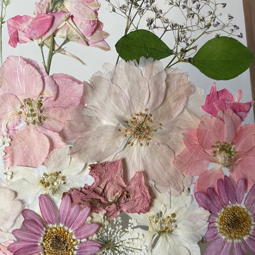 Květinový ručně vyrobený obraz s květy růžových a bílých barviček, které rostou ze spodu obrazu. Mezi květy najdete kopretiny, ostrožky, květy třešní a mnoho dalšího.