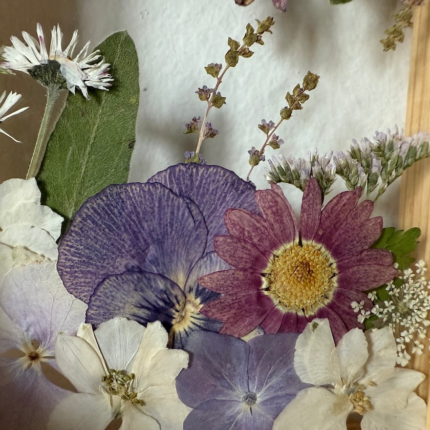 Květinový ručně vyrobený obraz s květy bílých a fialových barev, které rostou z rohů obrazu. Mezi květy najdete macešku, hortenzie, ostrožky a další.