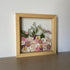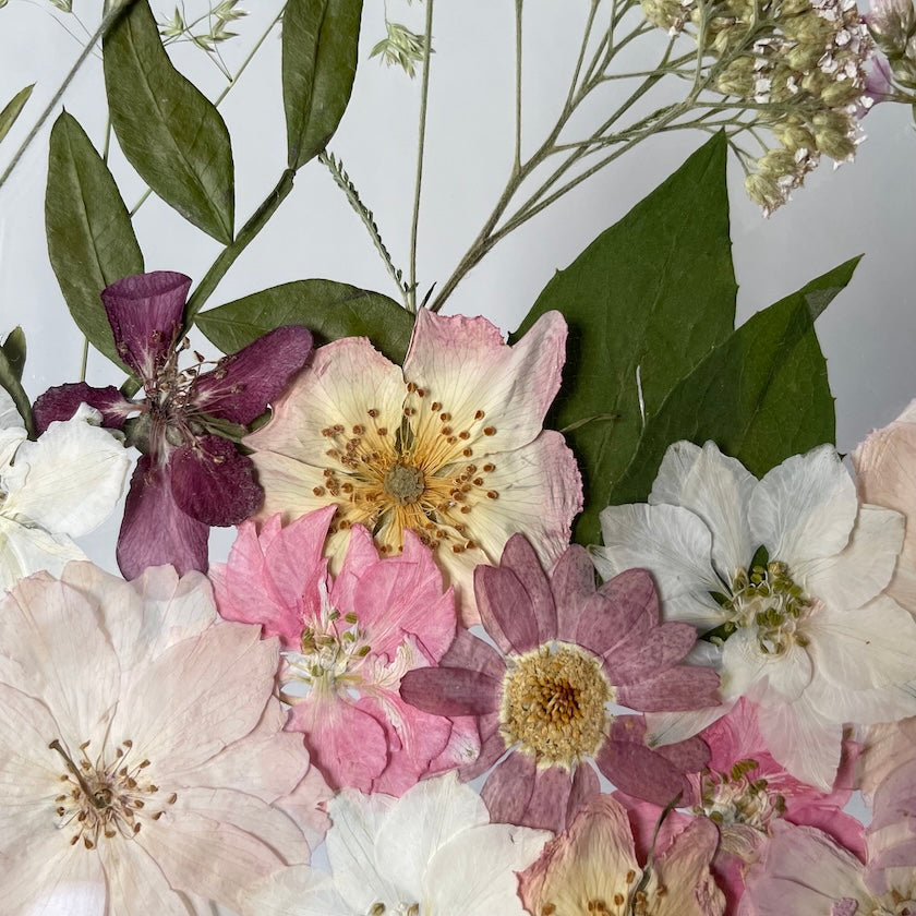 Květinový ručně vyrobený obraz s květy v růžových a bílých barvách, které rostou ze spodu obrazu. Mezi květy najdete květy třešní, růže, ostrožky a mnoho dalšího.
