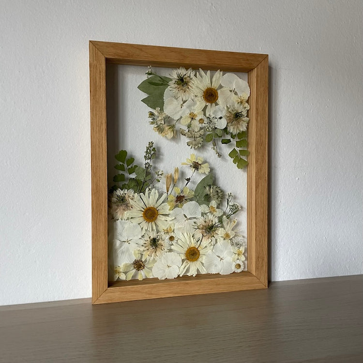 Květinový ručně vyrobený obraz s květy v bílých barvách, které rostou z rohů obrazu. Mezi květy najdete hortenzie, černuchy, kopretiny a mnoho dalšího.