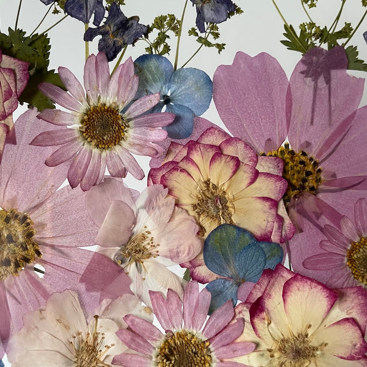 Květinový ručně vyrobený obraz s květy růžových, modrých a fialových barviček, které rostou z rohů obrazu. Mezi květy najdete krásenky, hortenzie a mnoho dalšího.