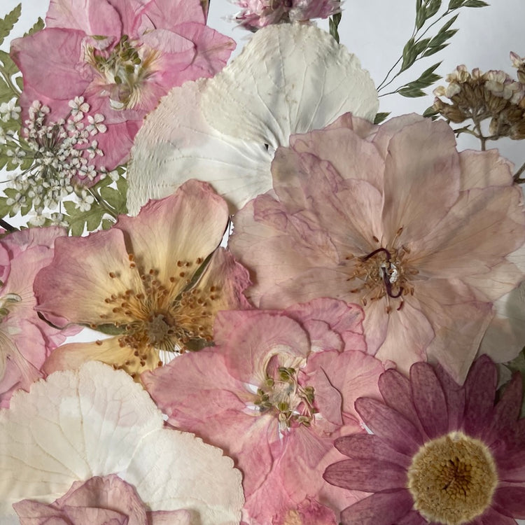 Květinový ručně vyrobený obraz s květy v růžových barvách, které rostou ze středu obrazu. Mezi květy najdete květy třešní, ostrožky, růže a mnoho dalšího.