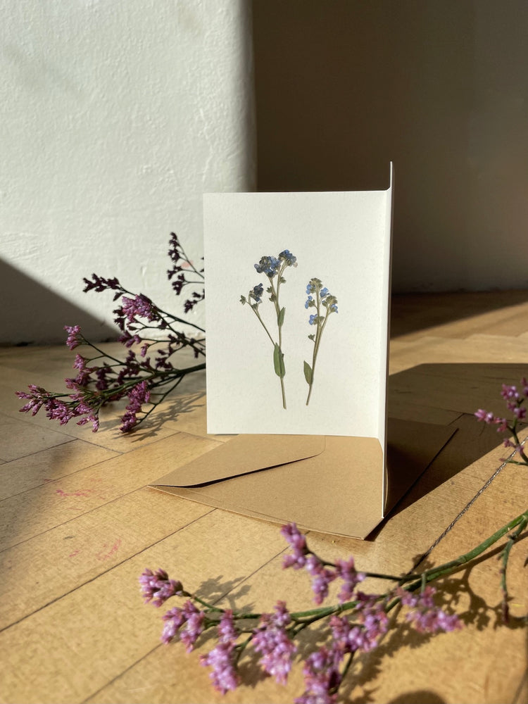 Potěšte své blízké květinovým přáním s pravými vylisovanými pomněnkami nalepenými uvnitř přání přírodním tvrdém papíru. Přední i druhá polovina přání je čistá pro napsání vzkazu od srdce. Darujte jej spolu s obrazem nebo jen tak. ❤️