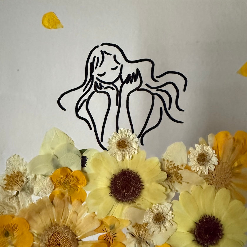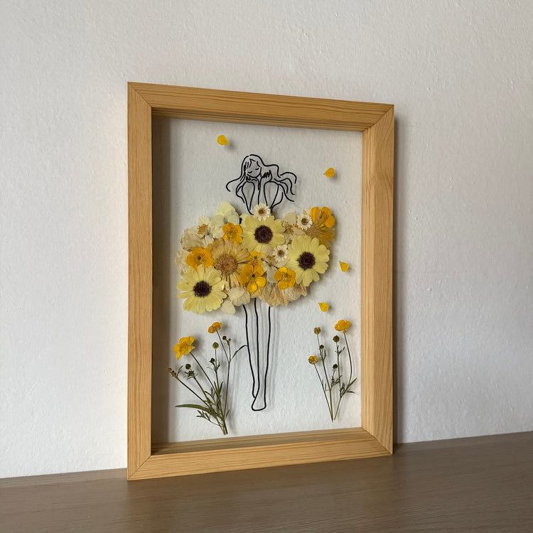 Květinový ručně vyrobený obraz s originální malovanou siluetou s květy ve žlutých barvách.