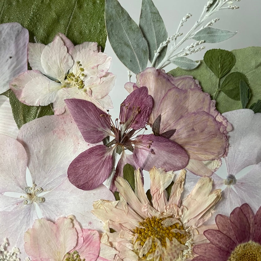 Květinový ručně vyrobený obraz s květy v růžových barvách, které rostou z rohů obrazu. Mezi květy najdete květy třešní, ostrožky, růže a mnoho dalšího.