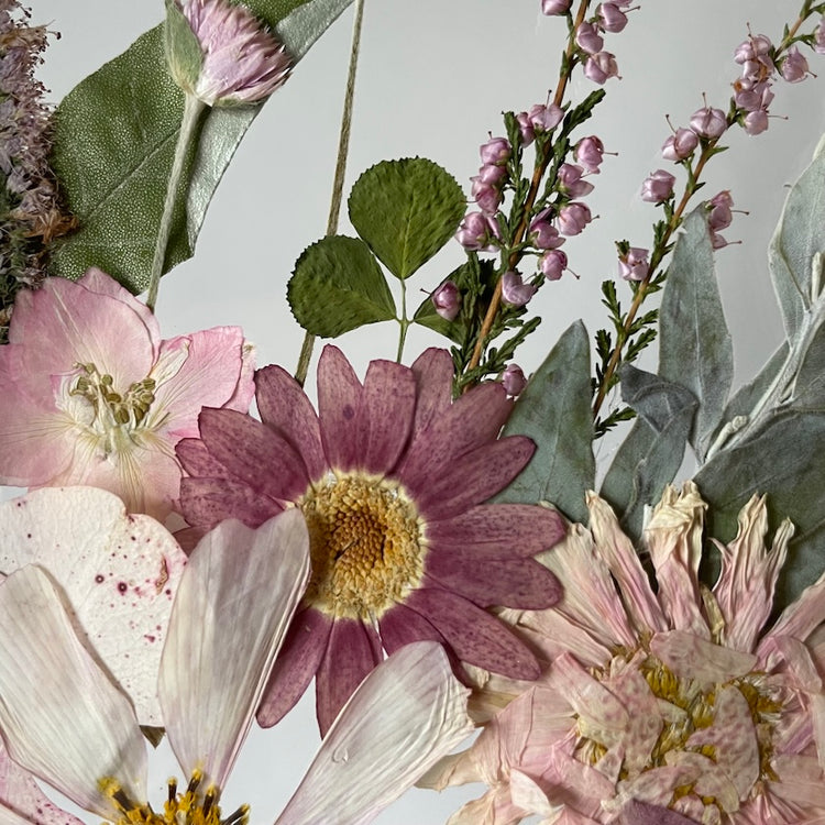 Květinový ručně vyrobený obraz s květy v růžových barvách, které rostou ze spodu obrazu. Mezi květy najdete květy třešní, ostrožky, růže a mnoho dalšího.