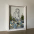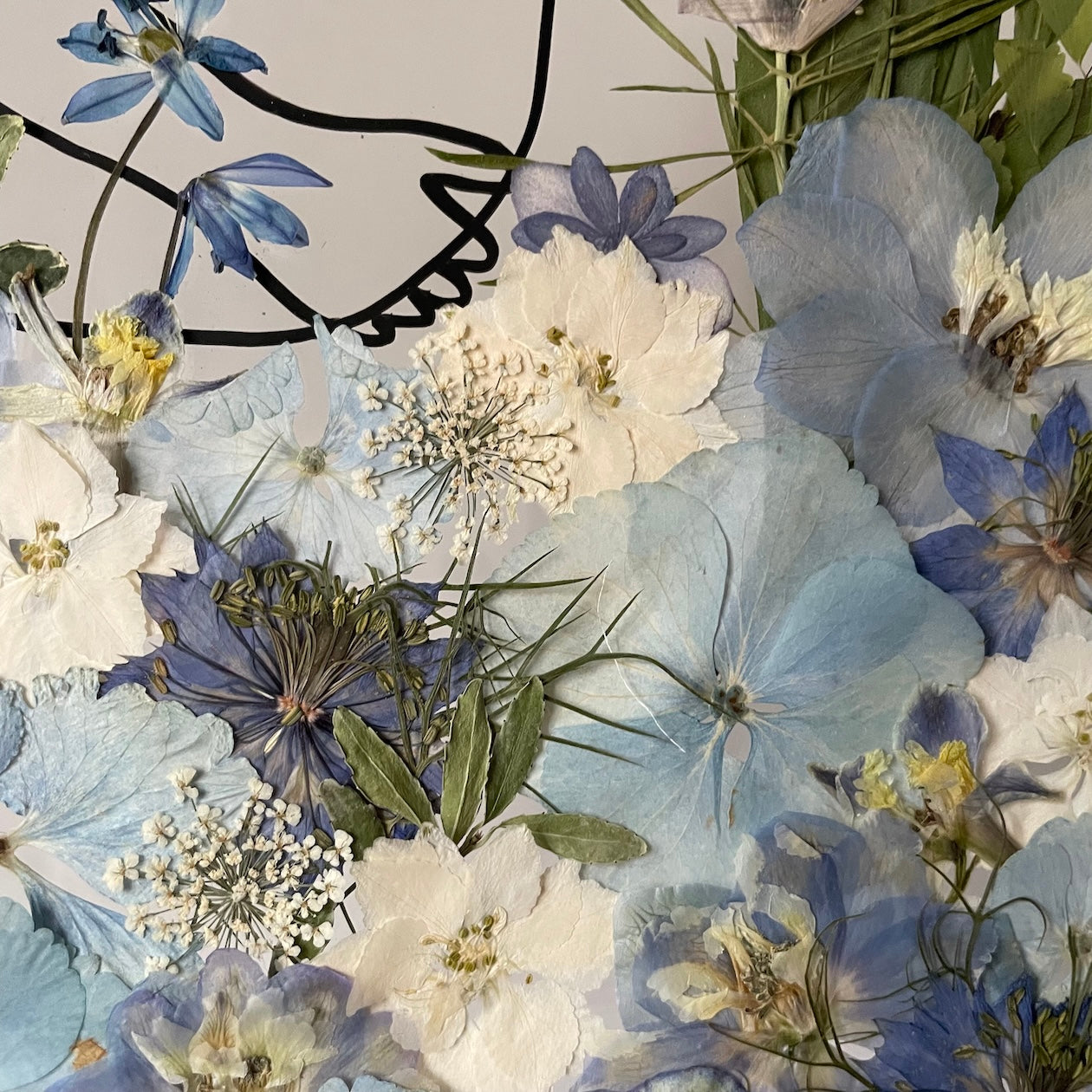 Květinový ručně vyrobený obraz s originální malovanou siluetou s květy v modrých a bílých barvách.