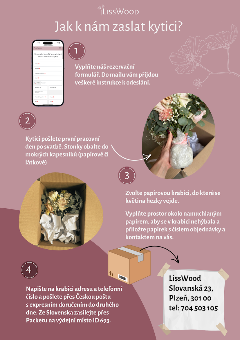 Vyplnit formulář- Vy sama jste nevěstou: vyplňte náš rezervační formulář. I pokud jste dostala poukaz. Květiny můžete PRVNÍ PRACOVNÍ DEN PO SVATBĚ doručit osobně do Plzně nebo zaslat přes Českou poštu s expresním doručením do druhého dne, je to nejrychlejší. Pokud si nevěsta přeje kytici ponechat, můžete nám doručit i kvítí z výzdoby.
